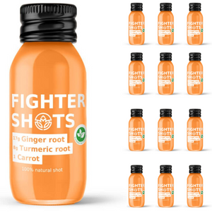 ABOUT THE SHOT: Fighter Shots' latest VEGAN product, the Carrot + Ginger + Turmeric Shot, combines 1 carrot, 17g of raw organic ginger, and 8g of raw organic turmeric per 60ml bottle. Crafted using our signature cold-pressed method, it provides a refreshing and invigorating daily wellness boost with no honey, sugar, or added sweeteners.